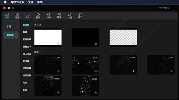 2、剪映mac专业版有一个重要的功能特点:和手机版一样内置了海量的素材,并且非菜单方式,完全的可视化,包括视频素材库,音频素材库,文本素材,超多的贴纸库,特效素材,丰富的可视化转场,以及滤镜。